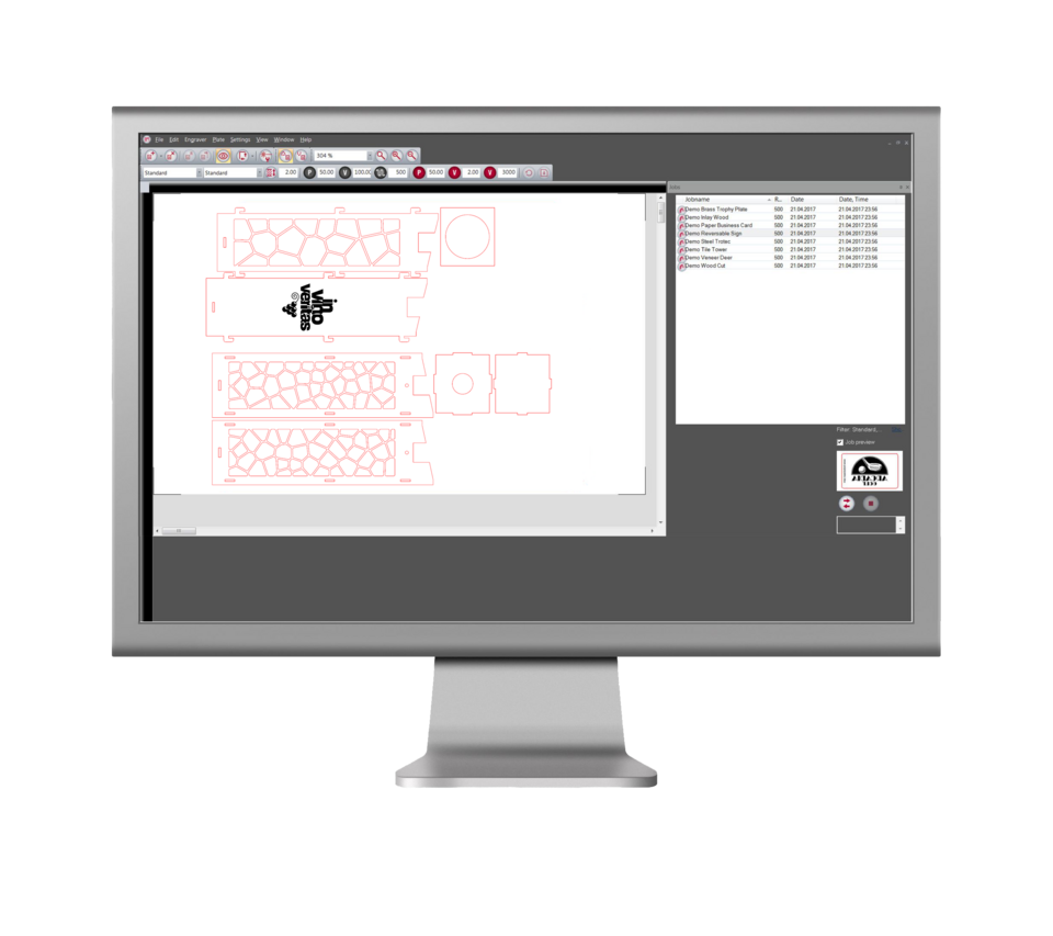 Las imágenes para el grabado suelen enviarse a través del software de grabado directamente desde el programa gráfico a la grabadora láser. La consecuencia es un manejo cómodo de los datos, lo cual hace también posible realizar rápidamente cambios en la imagen. Además, la función de posicionamiento del software de láser ("anidamiento" es el concepto clave) ayuda a reducir el desperdicio de material.